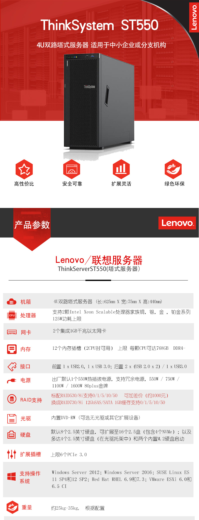 联想(Lenovo) ThinkSystem ST550 塔式服务器(2*Intel Xeon Silver 4215/2*32GB/3*8TB/2*ThinkSystem 1100W)