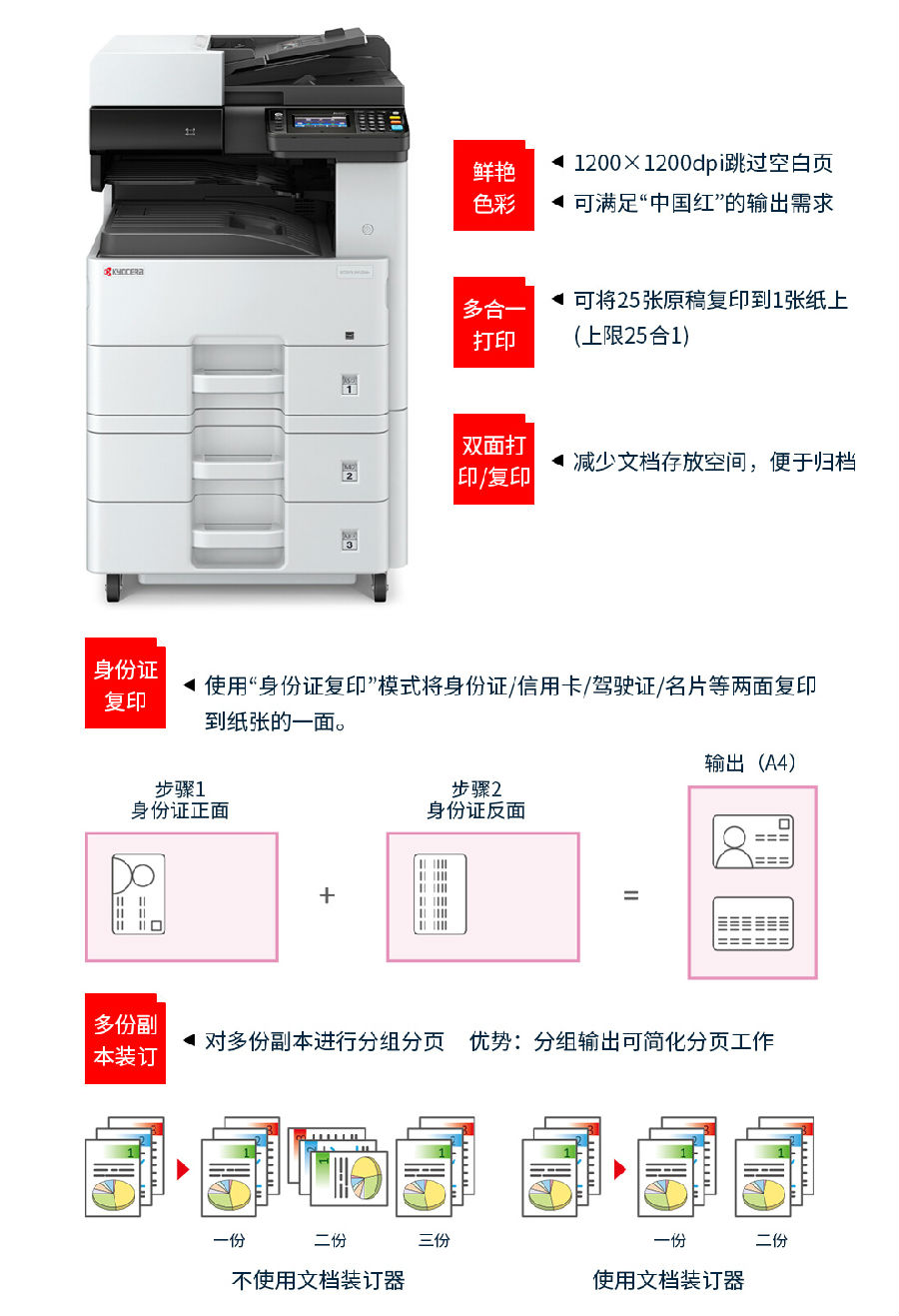 • 包装清单:盖板 输稿器 供纸盒 装订器 连接器 打印内存 IC卡读卡器 IC卡认证组件